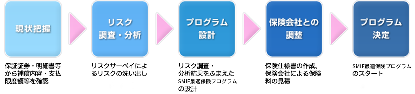 そのうえで、リスクサーベイを実施してリスク分析・評価を行い、改めて問題点と検討課題を抽出し、これらを解決するSMIF最適保険プログラムをご提案します。